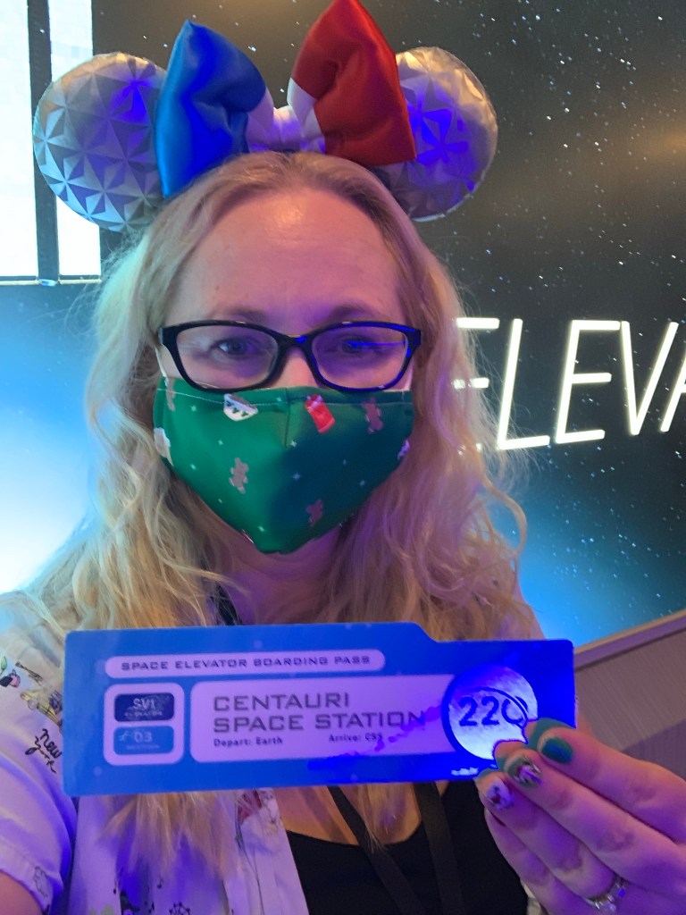 When you step inside the restaurant, you will receive a Space Elevator Boarding Pass to the Centauri Space Station. From that moment, you’re hooked. It’s so very cool; cue the ooohs. Next, you’re escorted into the Space Elevator and up you go…to Space! I was totally geeking out at this moment.