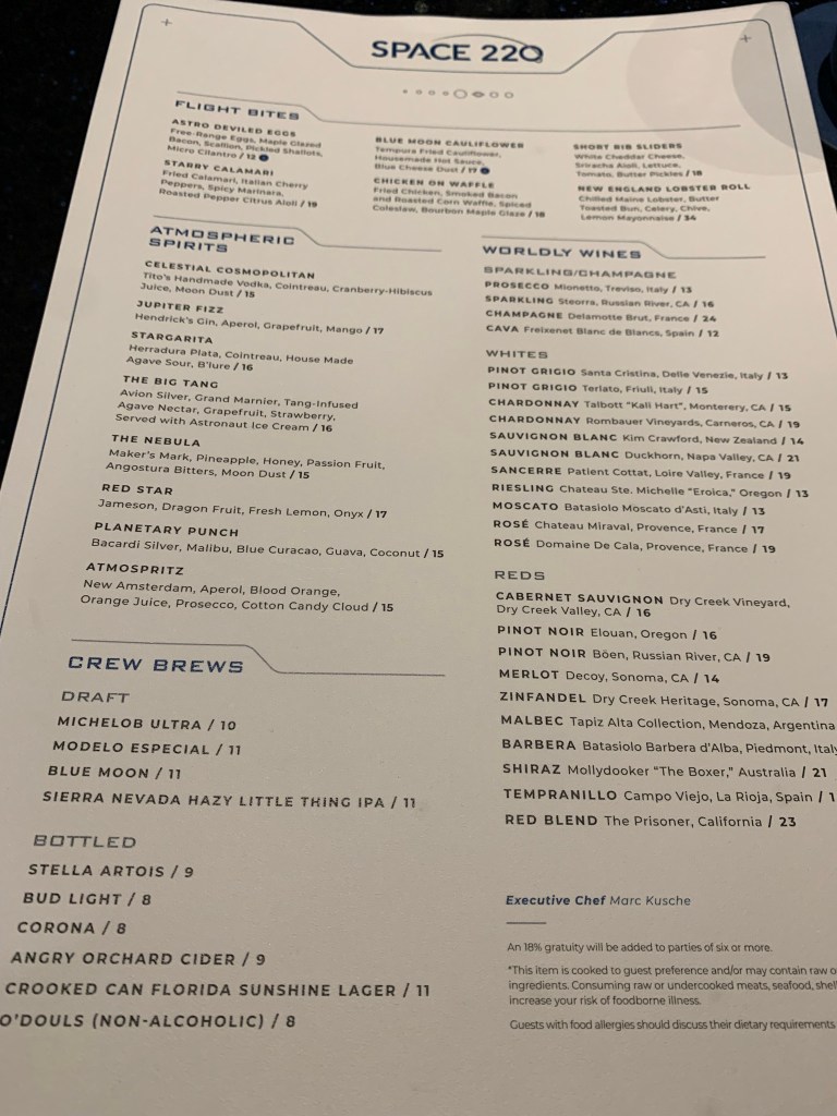 By the way, first class awards to my bartender, he was outstanding! I asked if I could have some of the Space 220 coasters to take home…he totally hooked a girl up! He handed me about a dozen coasters! #BestSouvenirEver