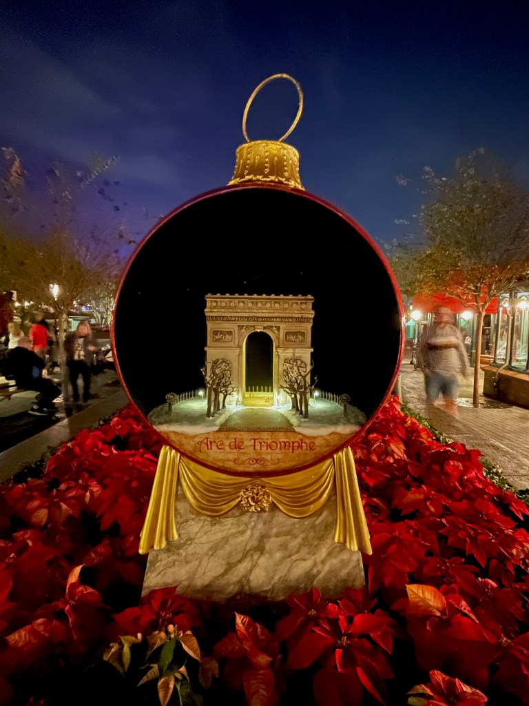 France. Marche de Noel Holiday Kitchen. Olaf was once again in the garden maze this year. Probably the prettiest holiday decor is France’s Ornaments like this one with the Arc de Triomphe inside.