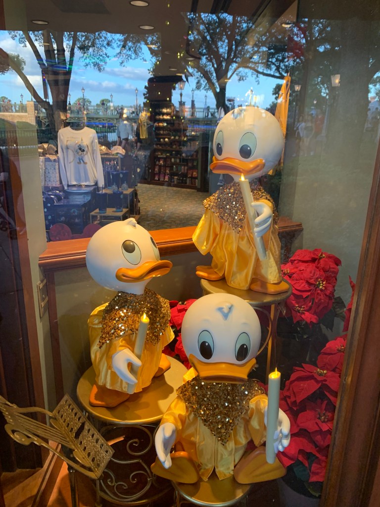 Huey, Dewey and Louie getting ready for the Candlelight Processional. Adorable display at Intl. Gateway entrance of EPCOT.