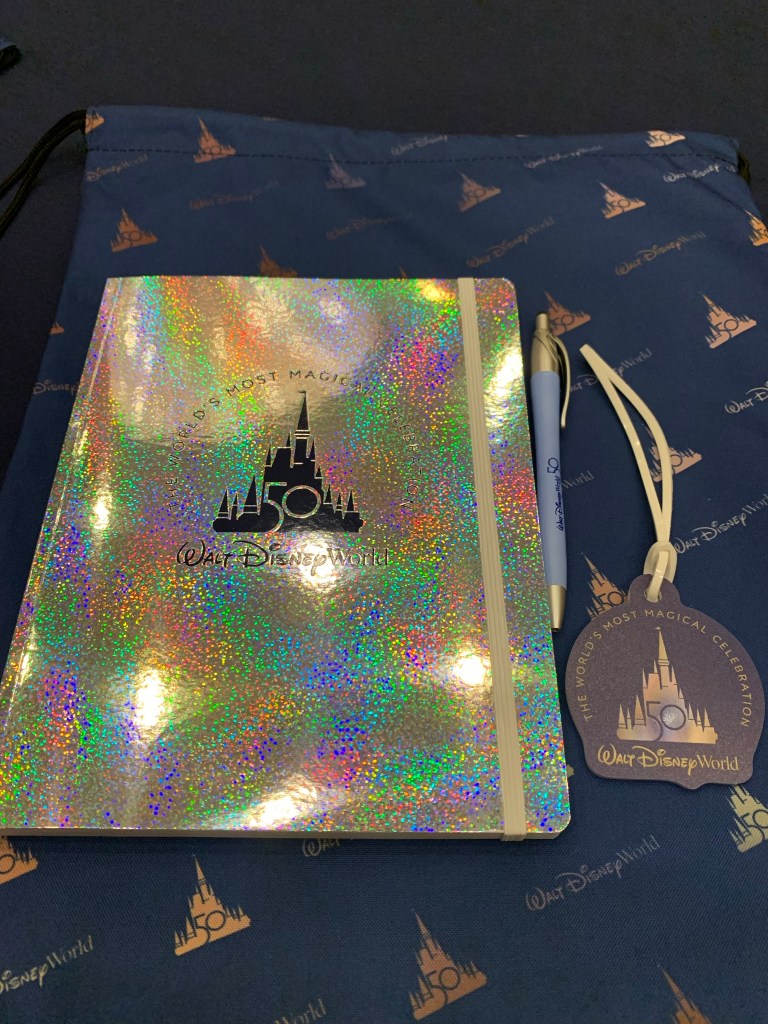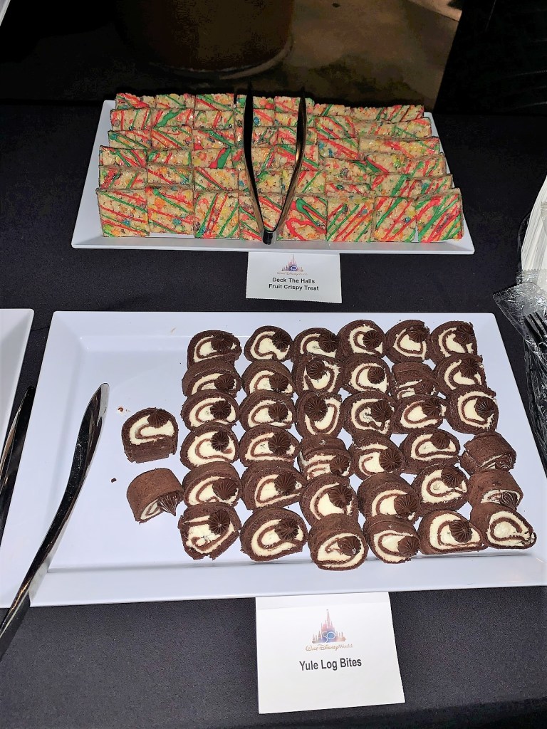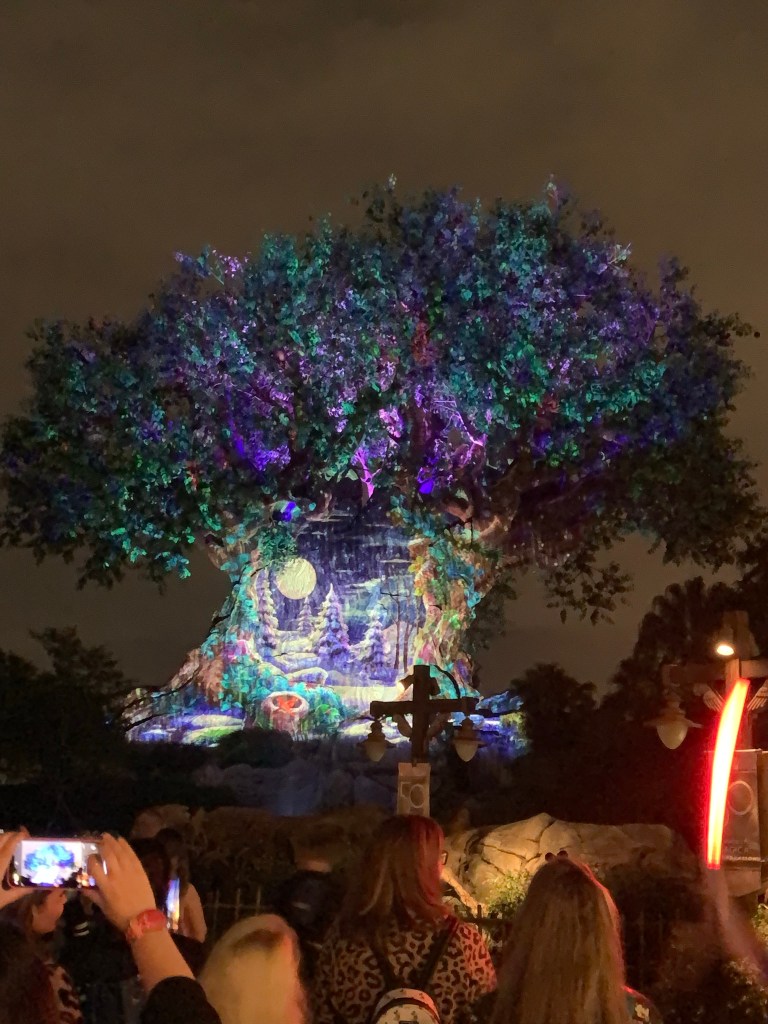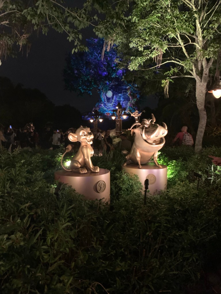 Our group met at 5 pm in the Grand Floridian Ballroom for a quick get to know each other session. We received a durable 50th anniversary cinch bag, a WDW 50th pen, a sparkly 50th Notebook and cool 50th Luggage Tag! On top of that, we got a WDW Lanyard with our name/agency ID. Very VIP. Then, we were off to Animal Kingdom Park. Did I mention we had a chartered bus! How Sweet. We arrived shortly before closing time and caught a very colorful 50th Celebration Winter-themed projection show on the Tree of Life. Then, we were escorted to a delicious catered buffet dinner outside at the Harambe Market. I loved it: lots of curry, spice and exotic flavors! The foodie in me was so satisfied.