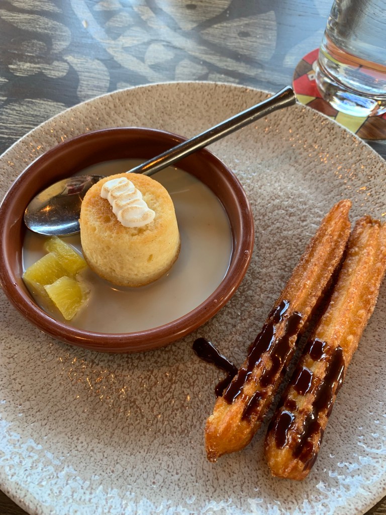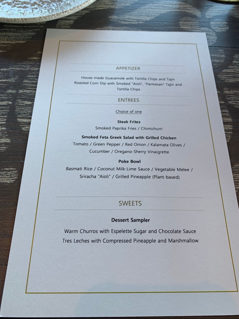 Next up, lunch at Three Bridges Bar & Grill at the Coronado Springs Resort. Again, we were offered a special menu and let me tell you, it was phenomenal. Have a look. Guacamole. Steak Frites. Churros. Tres Leches. 5 Stars, just YUM. The weather was perfect: sunny and 75, a dream come true. Perfect for dining al fresco.