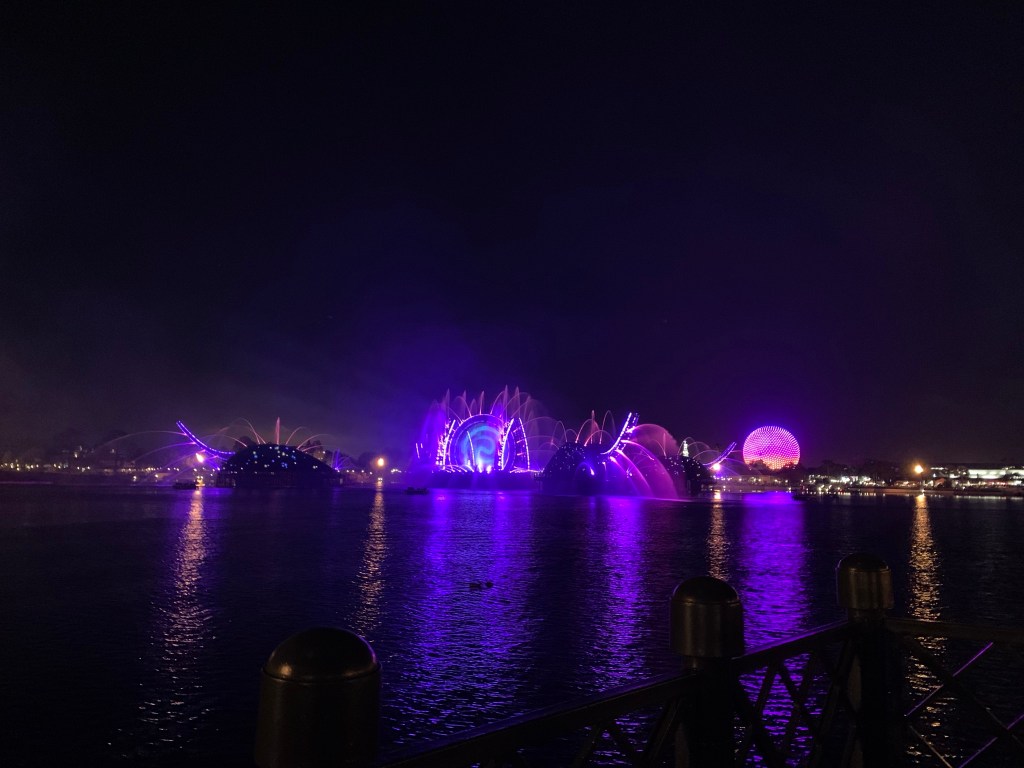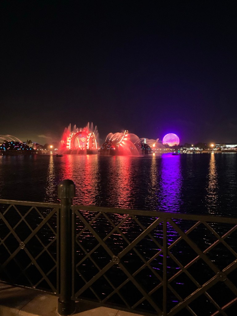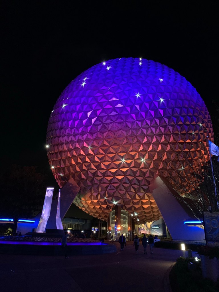 I arrived at Magic Kingdom at 6:45 pm and was so ready for the MAGIC! It was my first-time seeing Cinderella Castle all decorated and lit up for the 50th Celebrations! Enchanting. I rode my favorites: Haunted Mansion, Splash Mountain, Peter Pan and Pirates of the Caribbean. Thanks to Disney Genie+ and my smart stacking skills, I was able to ride a lot in just 2 hours. I also watched Mickey’s PhilharMagic. I left Magic Kingdom around 9:30 pm and hopped on the monorail to EPCOT for the Disney Deluxe resort’s Extended Evening Hours! 10pm to Midnight.