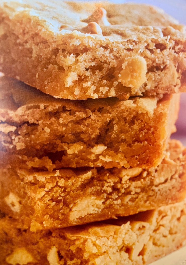 Pour batter into an 8 in. square baking dish. Spread evenly and tap pan on counter to distribute batter. Bake for 25-30 minutes, until light golden brown (dry on top). Remove blondies from oven. Cool on wire rack for 10 minutes. Cut into squares. Delicious!!