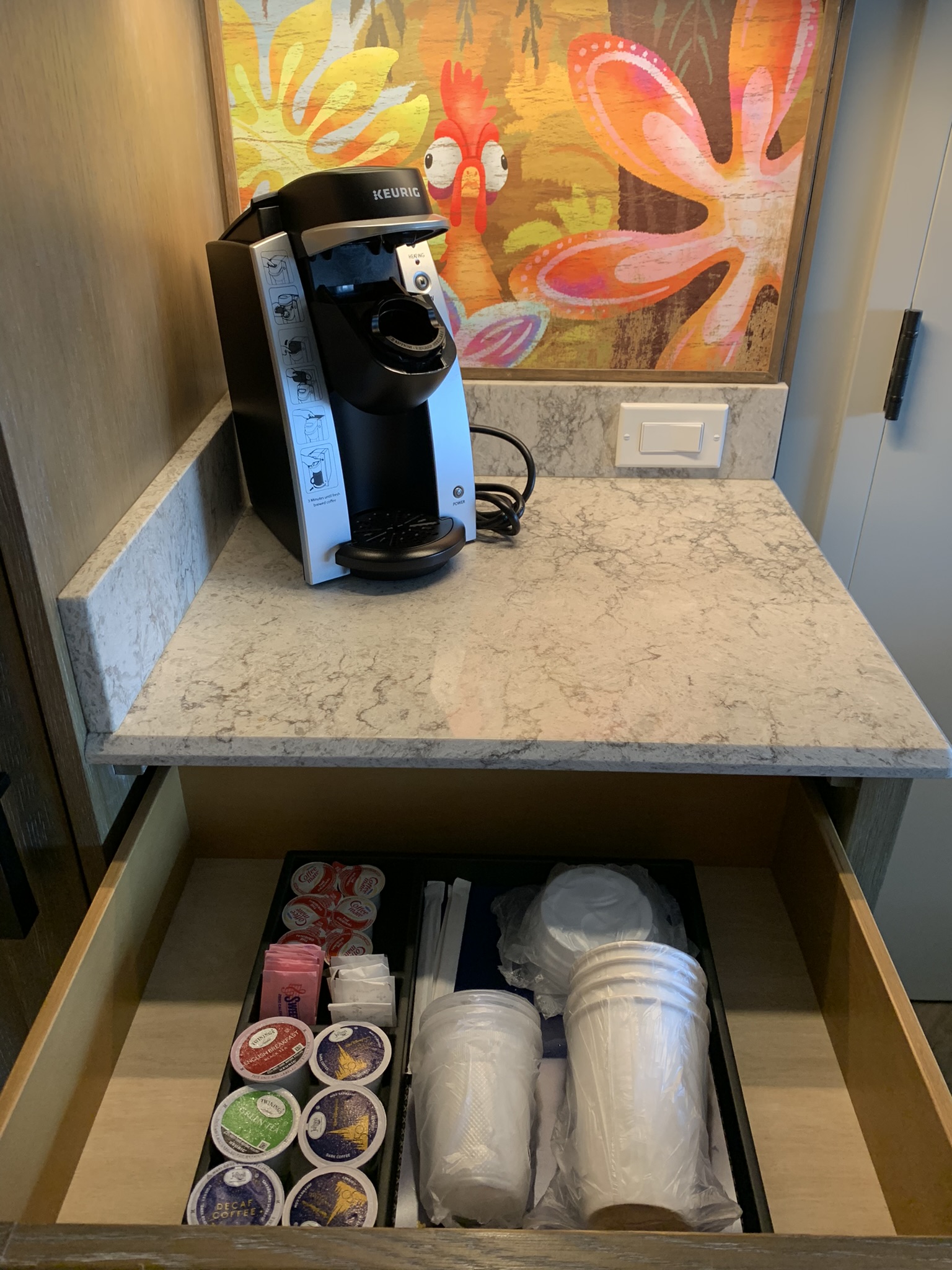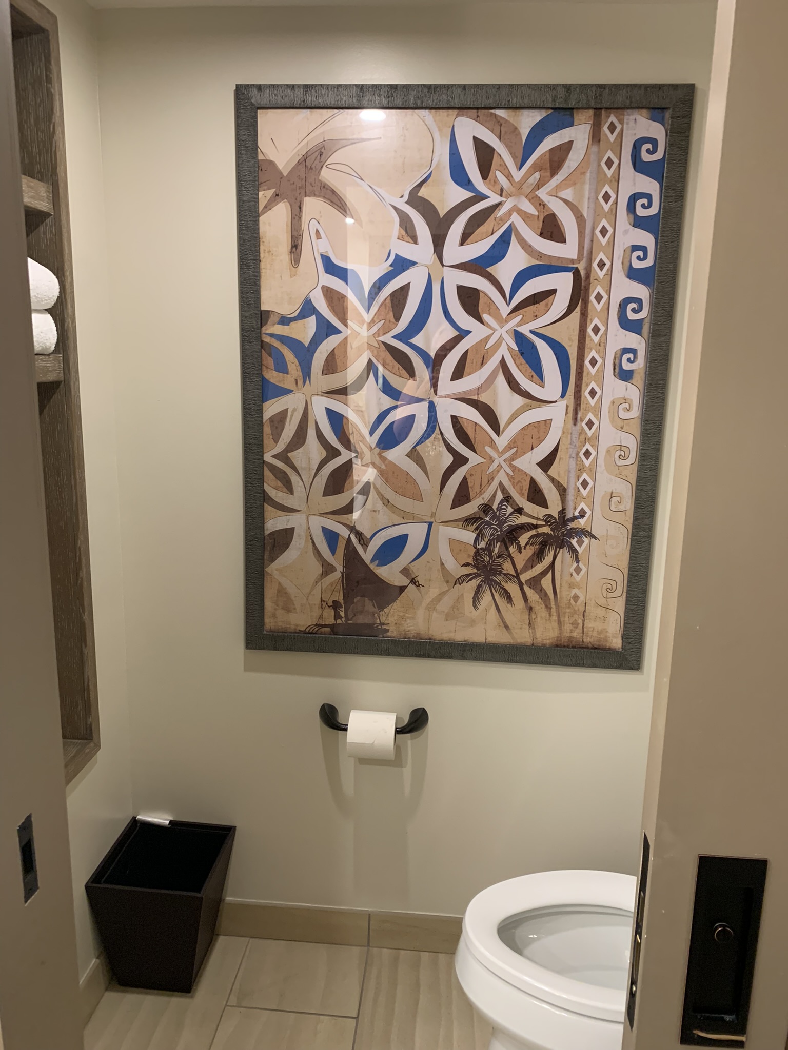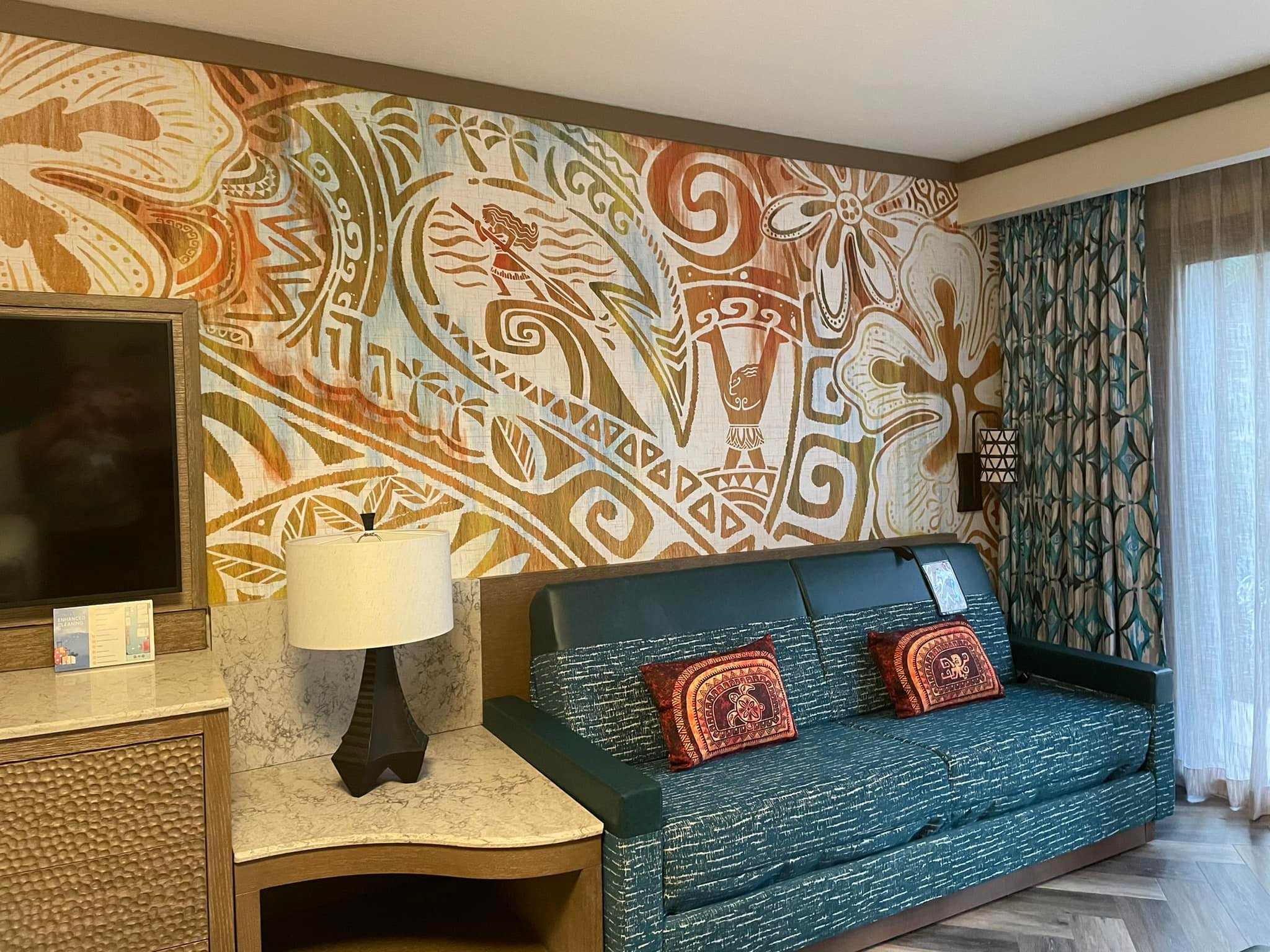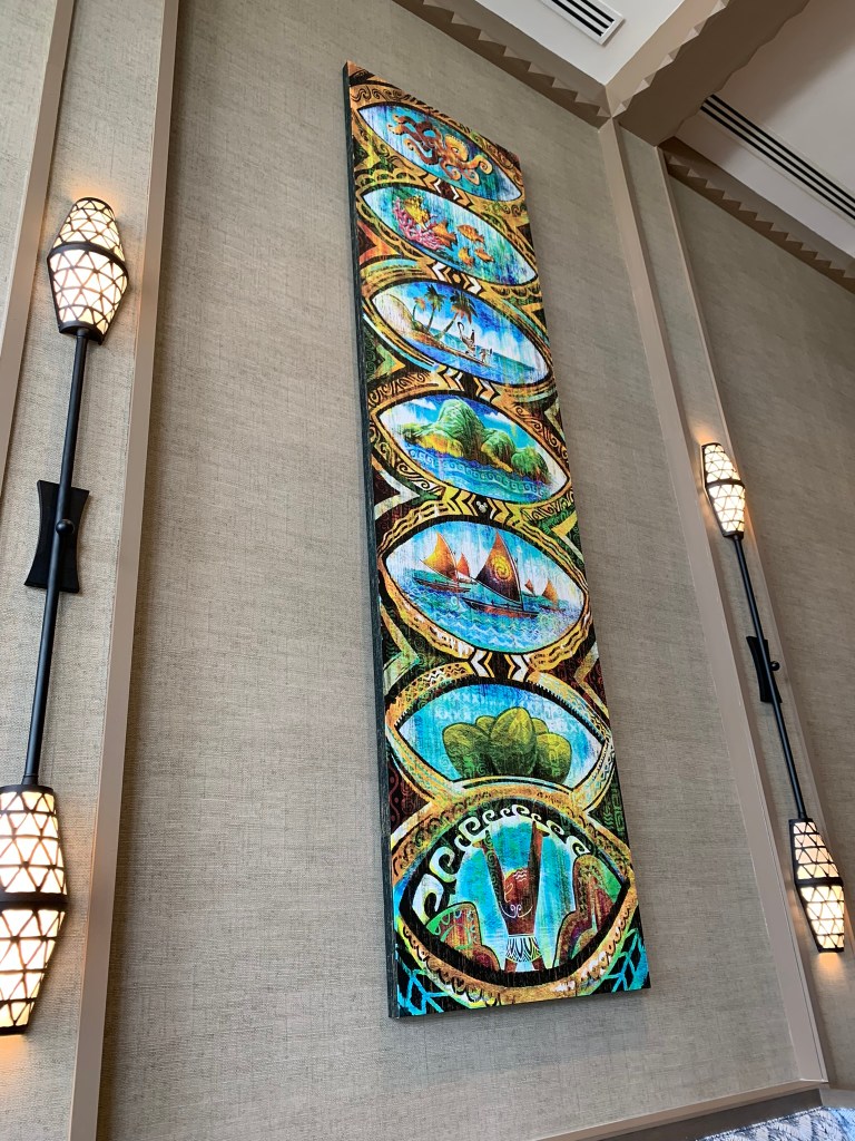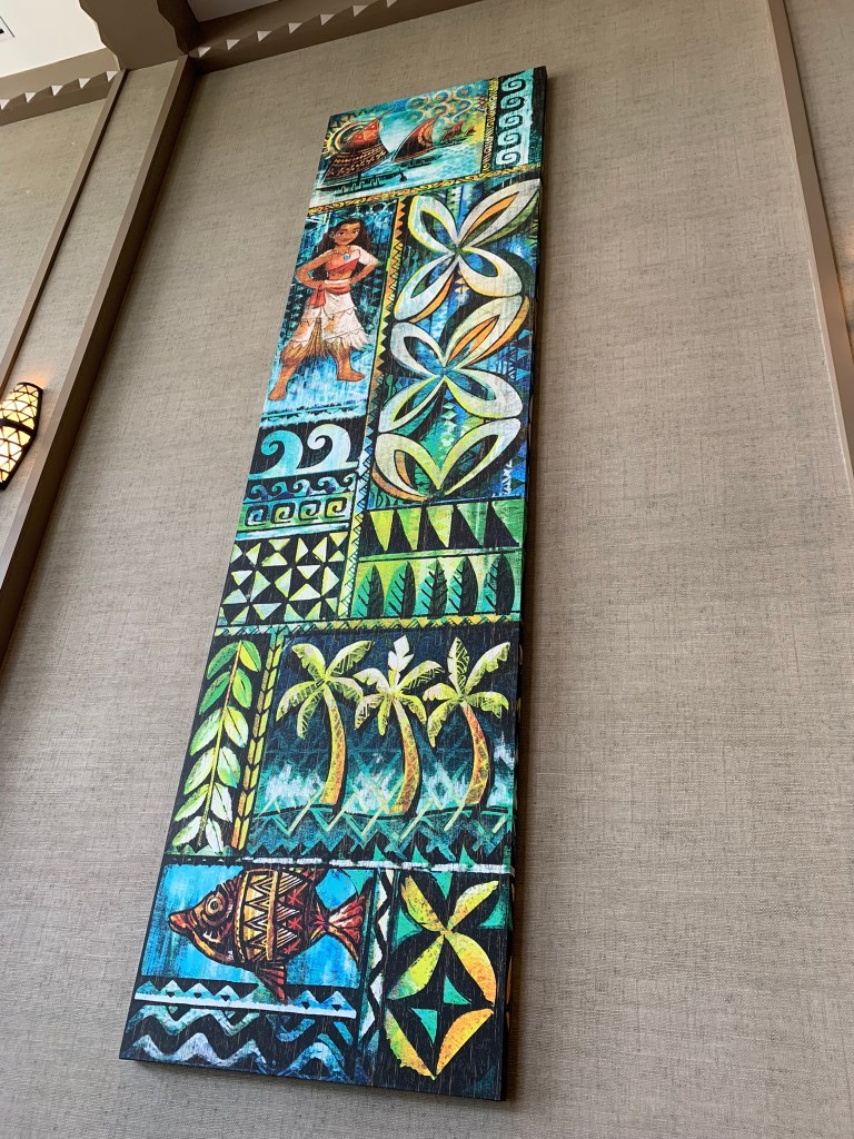 The room also has a Keurig coffeemaker, mini fridge, hair dryer, iron, patio or balcony. Extra pillows & blankets are available for the Sleeper Sofa. The bathroom (to note) has a gorgeous 2 sink vanity and comes with H2O+ toiletries. However, the vanity is directly across from the shower. So, that can make getting ready a little tricky. On top of that, the toilet is only accessible if you walk thru the vanity area. There is a door separating the toilet from vanity/shower area. There is also a door separating the sleeping/living area from the bathroom. I do love that feature. But I really wish Disney would have separated the vanity from the shower. FYI: All rooms at Poly are set up like this. As a big fan of Moana, the room is stunningly beautiful.