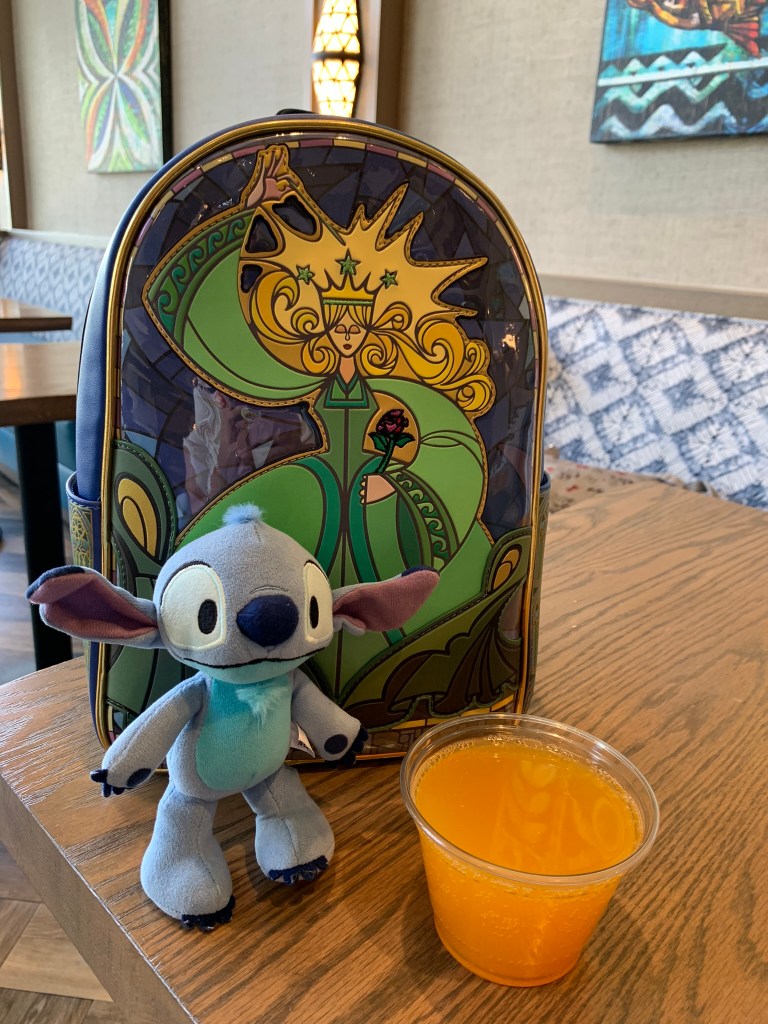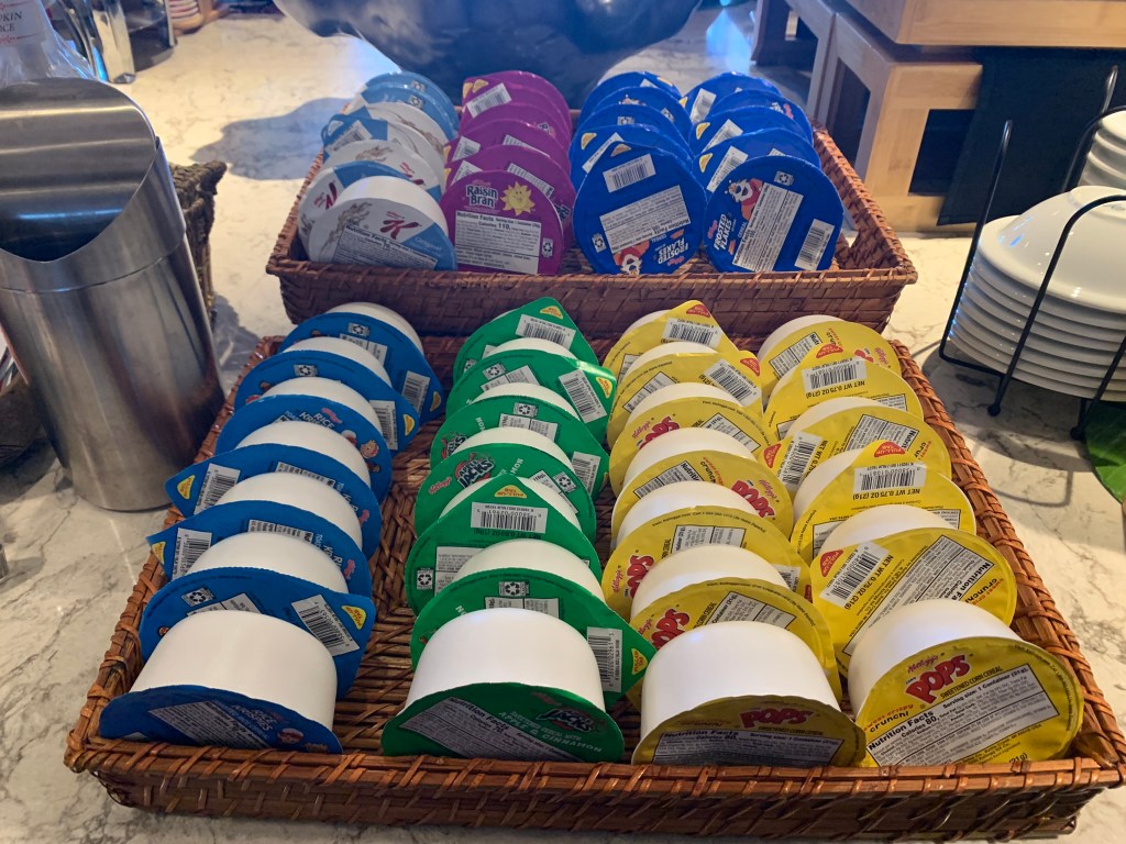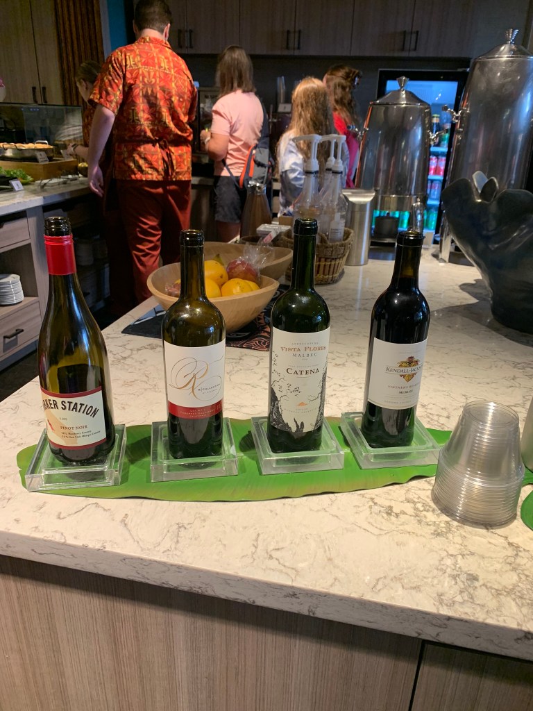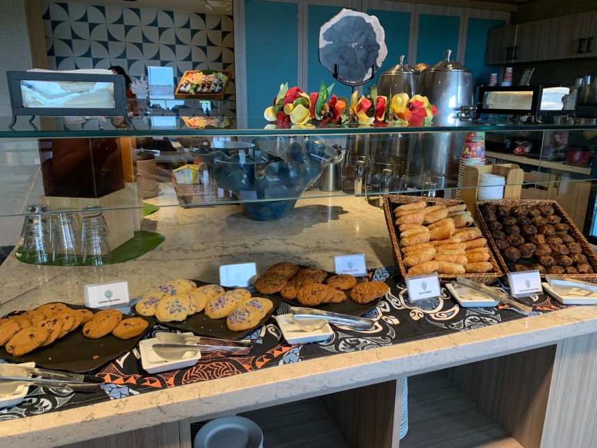 Pro Tip! Stock Up on some of these snacks, drinks and treats! Keep them in your room for later or take with you in the park. Drinks: lemonade, POG juice, Unsweetened Tea, Coffee, and Soft Drinks. A nice selection of beer is available, too. FYI: You can request beer or wine anytime just ask a cast member! Mid-day you’ll find assorted chips, fruit & snacks like granola bars & rice krispie treats. Chocolate Chip/Sugar/Oatmeal Raisin Cookies, Guava Danish, and white chocolate mocha muffin were available on our stay. Plus, hummus & crispy pita crackers and crudites with ranch made a great light snack option.