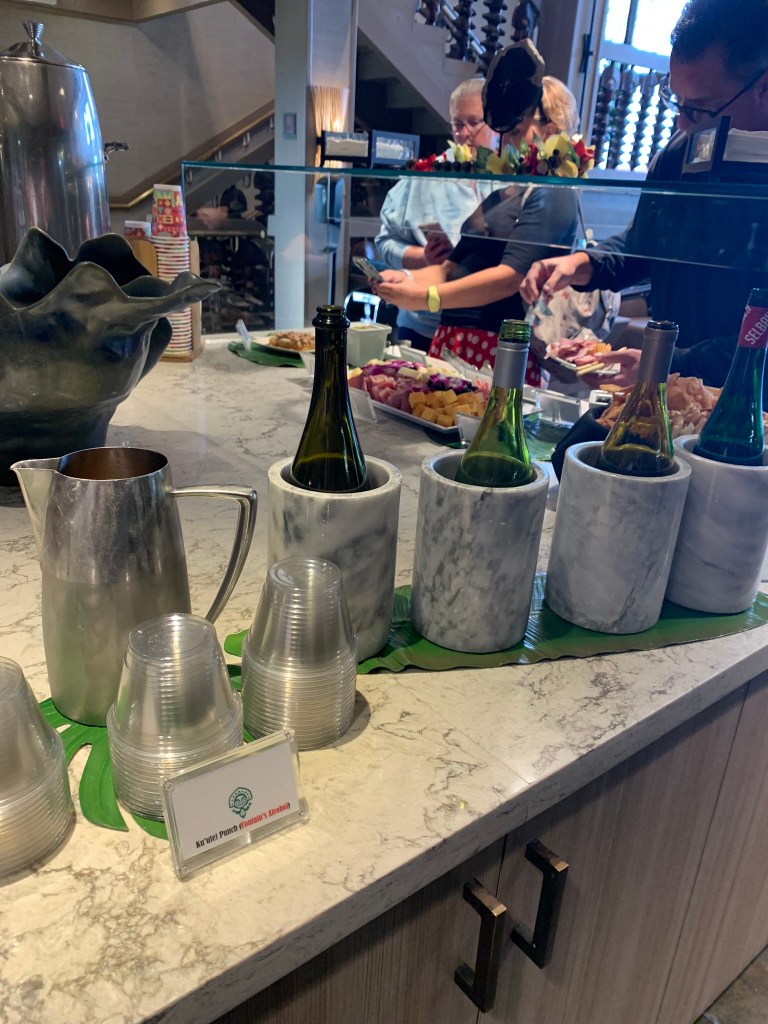 This is by far the BUSIEST time! It was very difficult getting any photos or videos…as you can see. The food is phenomenal! Lots of Asian inspired dishes, which I love. Plus, beer & wine. Fridge is always stocked with soft drinks. Here’s what we had: Pepper Horns (stuffed with cream cheese & quinoa), Tuna Tatake (raw tuna on bed of seaweed), Chicken Wellington, Fried Duck Leg (served over mashed cauliflower), Hamburger Sliders with toppings, Macaroni & cheese, Honeycomb, Cheeses, Charcuterie-style Meats, Olives, Crackers and Crudité. Mickey Ice cream bars & ice cream sandwiches are often available, too. OMG…the tuna was mouthwatering, and the fried duck was beyond delicious!! Sooo goood.