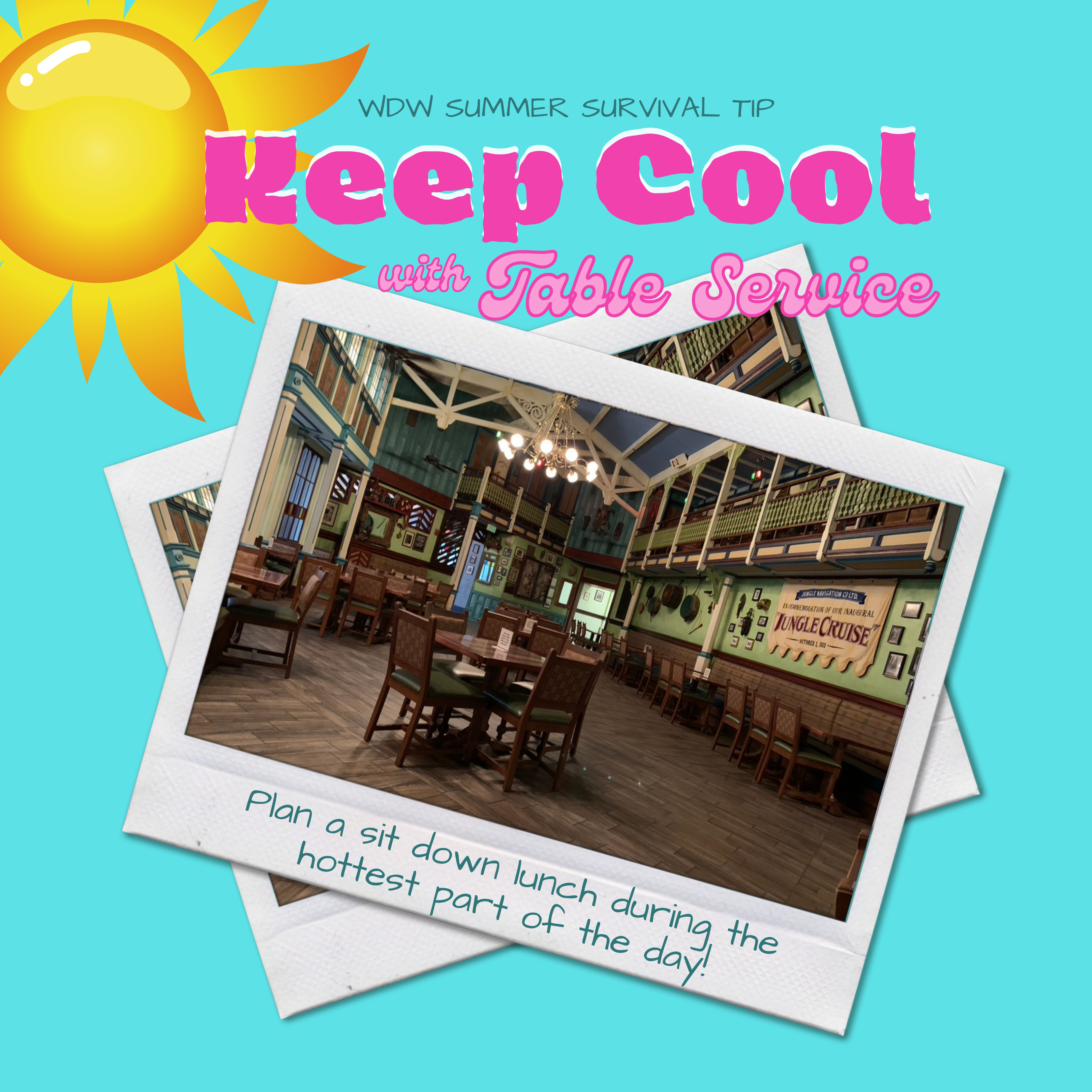 - Schedule a mid-day dining reservation. It’s typically less busy than lunch/dinner and plus, this is always the hottest part of the day! Also look for quick service restaurants with indoor seating ie. Cosmic Rays, Pecos Bills, Docking Bay 7, Backlot Express, Connections Cafe, Sunshine Seasons, Satuli Canteen, and Restaurantsaurus.
