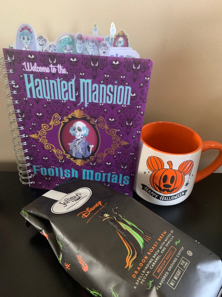 Prize Pack 1: Haunted Mansion Notebook, Joffrey’s Maleficent Coffee, and Happy Halloween Mickey Mug