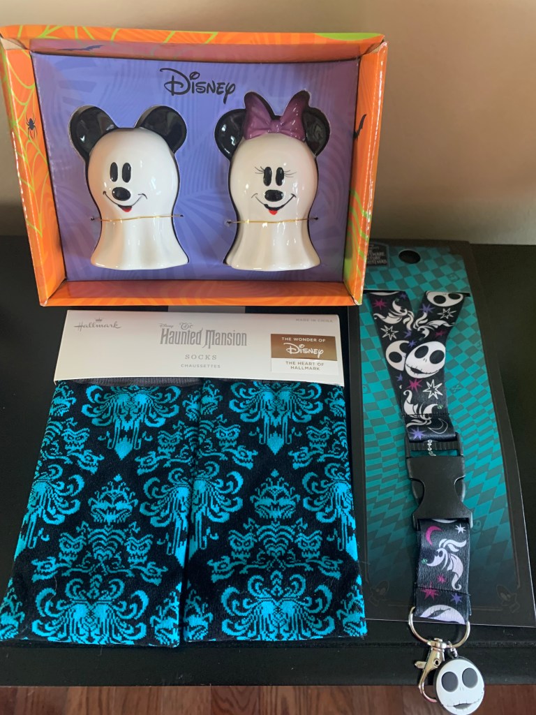 Prize Pack 2: Disney Ghost Mickey & Minnie Salt/Pepper Shakers, Haunted Mansion Socks, and Jack Skellington Lanyard