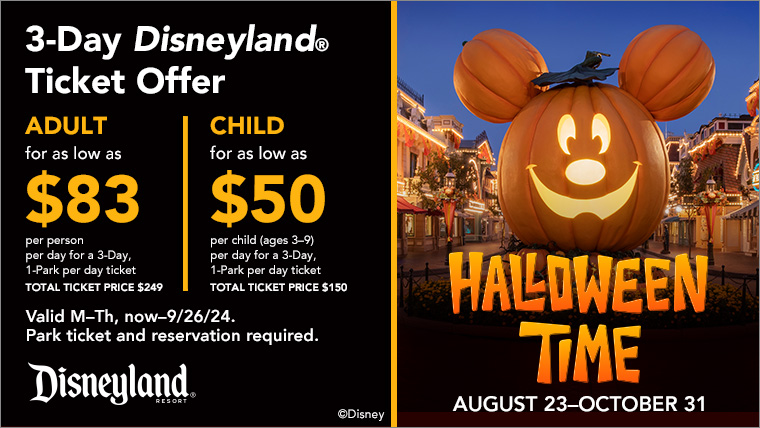 WOW! Visit the Disneyland Resort theme parks for as little as $50 per child per day (ages 3-9) or $83 per day (ages 10+) with the purchase of a special 3-day, 1-park per day ticket valid Monday through Thursday. Park Hopper & Disney Genie+ can be added for addtl. cost.