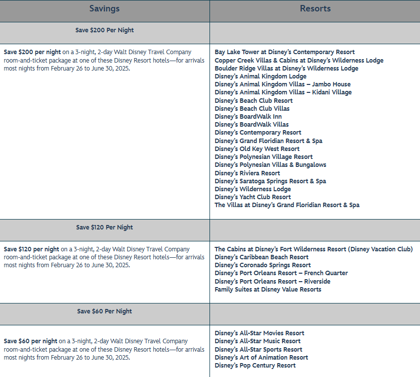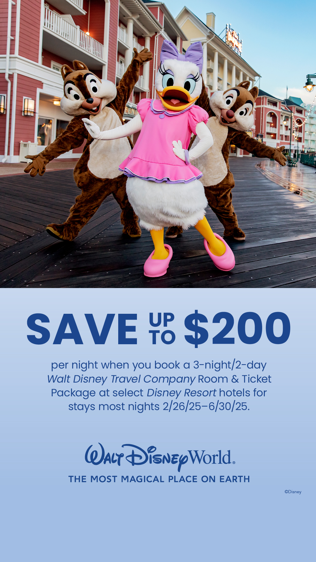 Offer excludes the following room types: Campsites; 3-Bedroom Villas; Deluxe Resort Suites; Club Level Rooms; Cabins at Copper Creek Villas & Cabins at Disney’s Wilderness Lodge; Tower Studios at Disney’s Riviera Resort; and Bungalows and Island Tower 2-Bedroom Penthouses at Disney’s Polynesian Villas & Bungalows.