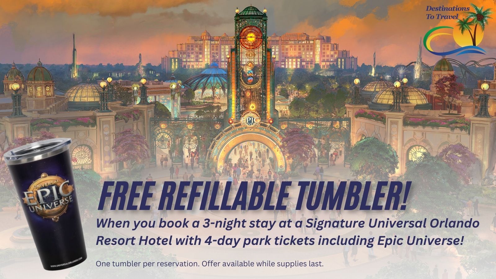 D2Travel is gifting a refillable tumbler for min. 3-night stay at a Universal Signature hotel & 4-day tickets including EPIC Universe. **