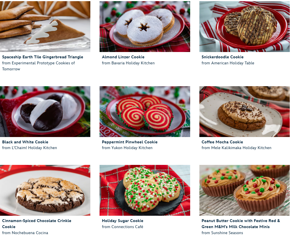Cookie Stroll: Purchase 5 of the following Cookies to redeem a special treat from Holiday Sweets & Treats! Spaceship Earth Tile Gingerbread Triangle (New), Holiday Sugar Cookie, Hazelnut Linzer Cookie, SNICKERS-Doodle Cookie made with SNICKERS bar pieces, Black and White Cookie (Plant-based), Peppermint Pinwheel Cookie, Coffee Mocha Cookie topped with coffee-infused buttercream, cocoa nibs, and chocolate-covered espresso beans (New) , Cinnamon-spiced Chocolate Crinkle Cookie, Peanut Butter Cookie made with Red & Green M&M’S Milk Chocolate Minis