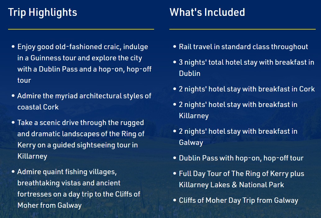 From the coastal gem of Dublin to the majestic beauty of the UNESCO-listed Cliffs of Moher and the seaside villages and rocky coastline of the Ring of Kerry, some of Ireland’s most tantalizing gems await. Travel via Irish Rail between cities and make the most out of your stay with sightseeing tours to the most beautiful and popular highlights of Dublin, Cork, Killarney and Galway.